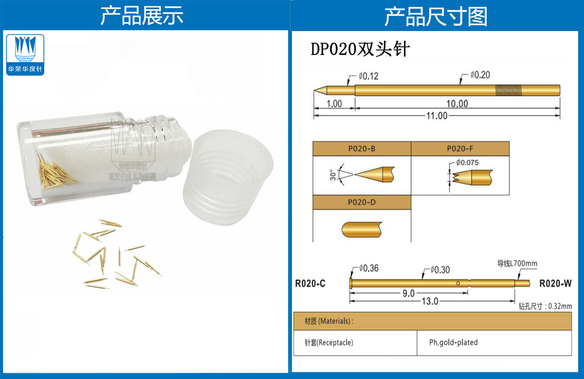 產(chǎn)品頭型:探針外徑為0.20mm,總長(zhǎng)度為5.7mm