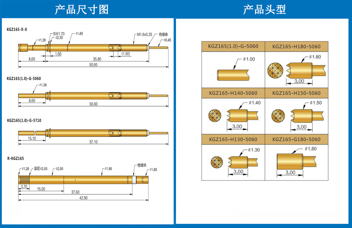 產品簡介:KGZ165探針、1.65mm測試針、總長50.60mm、彈簧針、測試針